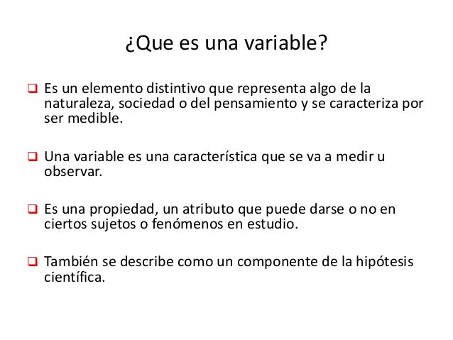 sociedad o del pensamiento y se caracteriza por ser medible. q Una variable es una característica que se va a medir u observar. q Es una propiedad, un atributo que puede darse o no en ciertos